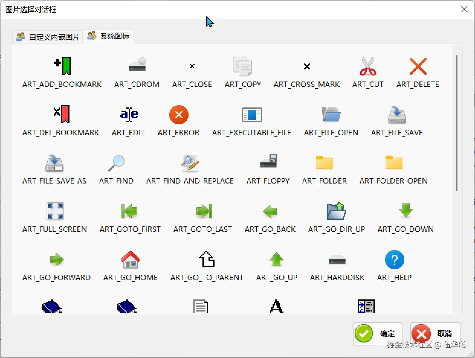 这里图标我们分为两类,一类是wxPython内置的图标资源,以wx.Art_开始。wx.ART_ 是 wxPython 提供的艺术资源(Art Resource)常量,用于在界面中快速访问通用的图标或位图资源。这些资源可以通过 wx.ArtProvider 获取,主要用于创建标准化的界面,例如工具栏、菜单和对话框中的图标。这类可以使用 wx.ArtProvider.GetBitmap 或 wx.ArtProvider.GetIcon 获取对应的位图或图标。