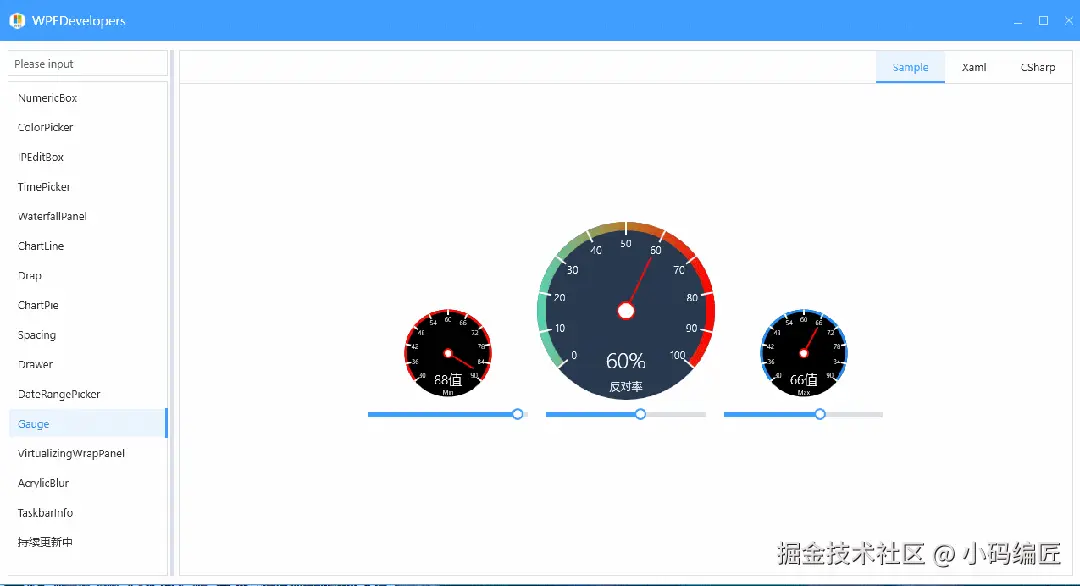 Gauge 继承 RangeBase,支持设置最大值、最小值以及当前值,并且可以显示一个动态的百分比值、标题、刻度。