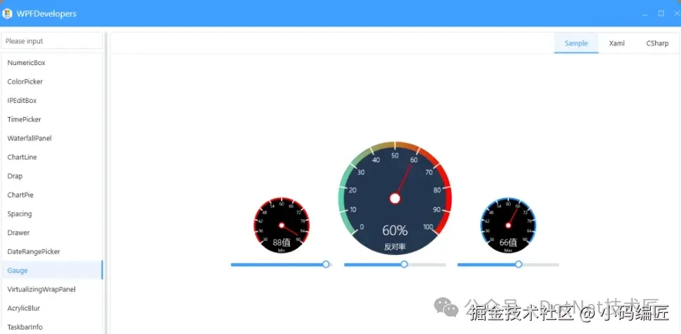 通过继承 RangeBase 并扩展其功能,我们成功创建了一个功能强大的 Gauge 控件,它不仅支持设置最大值、最小值以及当前值,还能够显示动态的百分比值、标题和刻度。