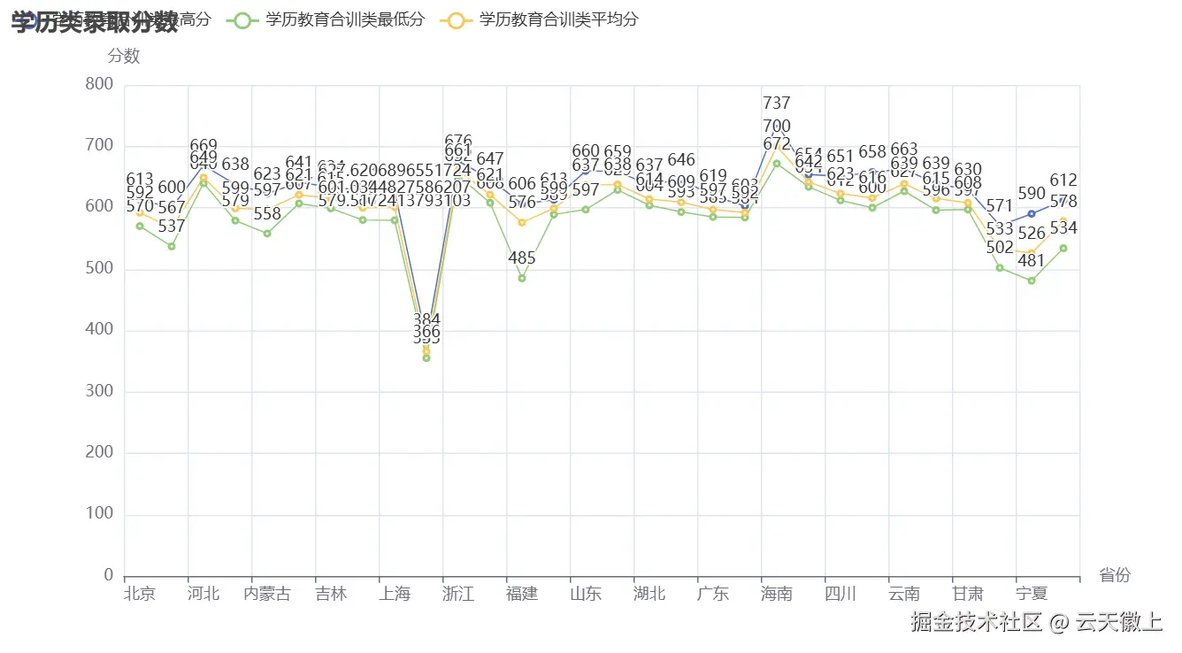 生成的折线图展示了学历教育合训类在不同省份的最高分、最低分和平均分的分布情况。可以看到,学历教育合训类的最高分在海南最高;最低分在江苏,和上面的结果一致。
