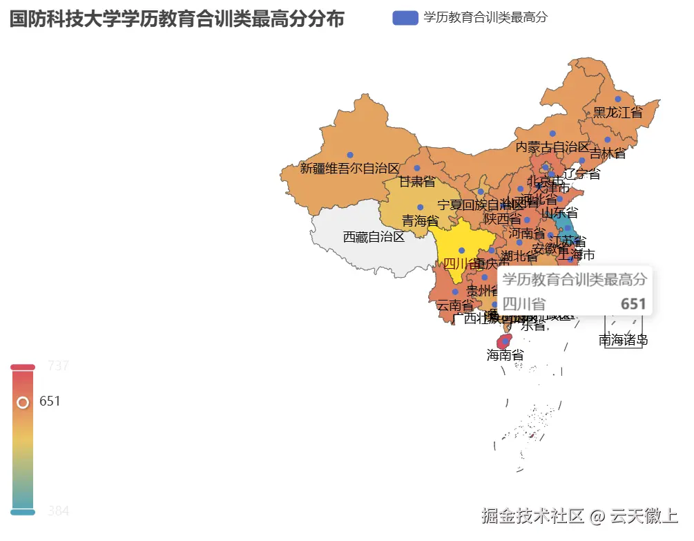 以('广东', [113.27, 23.13, 641])为例,'广东'表示省份,[113.27, 23.13]表示广东的经纬度,而641表示国防科技大学在广东省工程技术类招聘的最高分为641分; 具体的绘图代码如下: