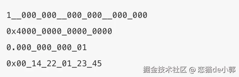 - Digit separators,允许使用下划线 (_) 作为数字分隔符,这有助于使长数字字面量更具可读性,例如多个连续的下划线表示更高级别的分组: