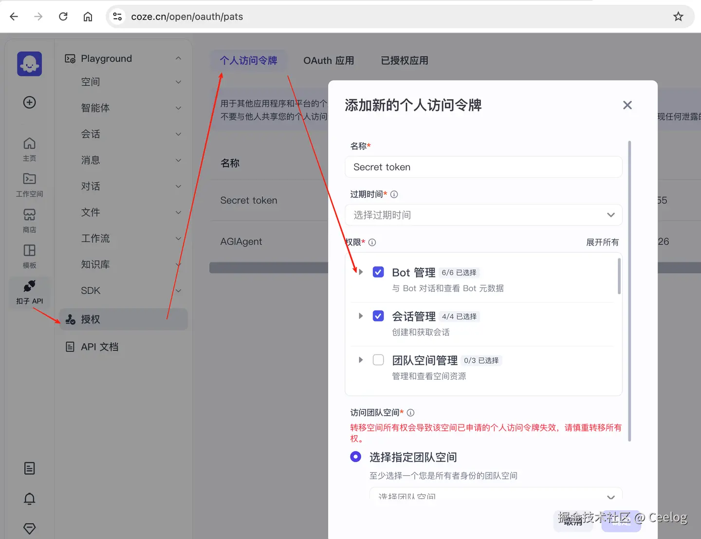 扣子 API -> 授权 -> 个人访问令牌,新建一个个人访问令牌,选择「Bot管理」「会话管理」「对话」「工作流」权限,有限期选择 30 天