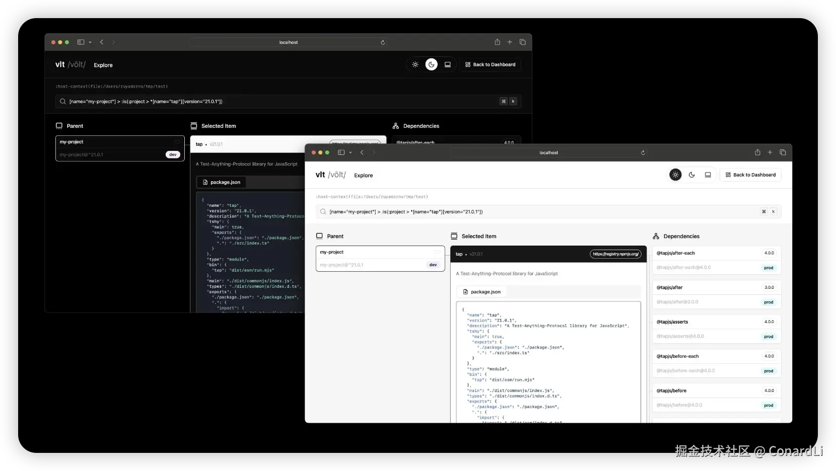 此次首发版本带来了令人印象深刻的 Node.js 依赖安装和管理能力。在大多数情况下,vlt 可以直接替换你现有的包管理器。乍一看,vlt 客户端可能与普通的包管理器类似,但我们兴奋地推出了一些创新功能,如全新的依赖查询选择器语法、各种导出格式(包括 Mermaid)以及直观的图形界面体验,帮助开发者更轻松地理解项目的依赖关系图。