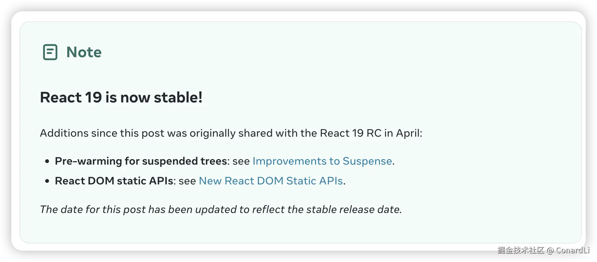 自从 4 月份 React 发布了 19 RC 版本后,经过 8 个月的漫长等待,React 终于发布了 19 的正式版本。