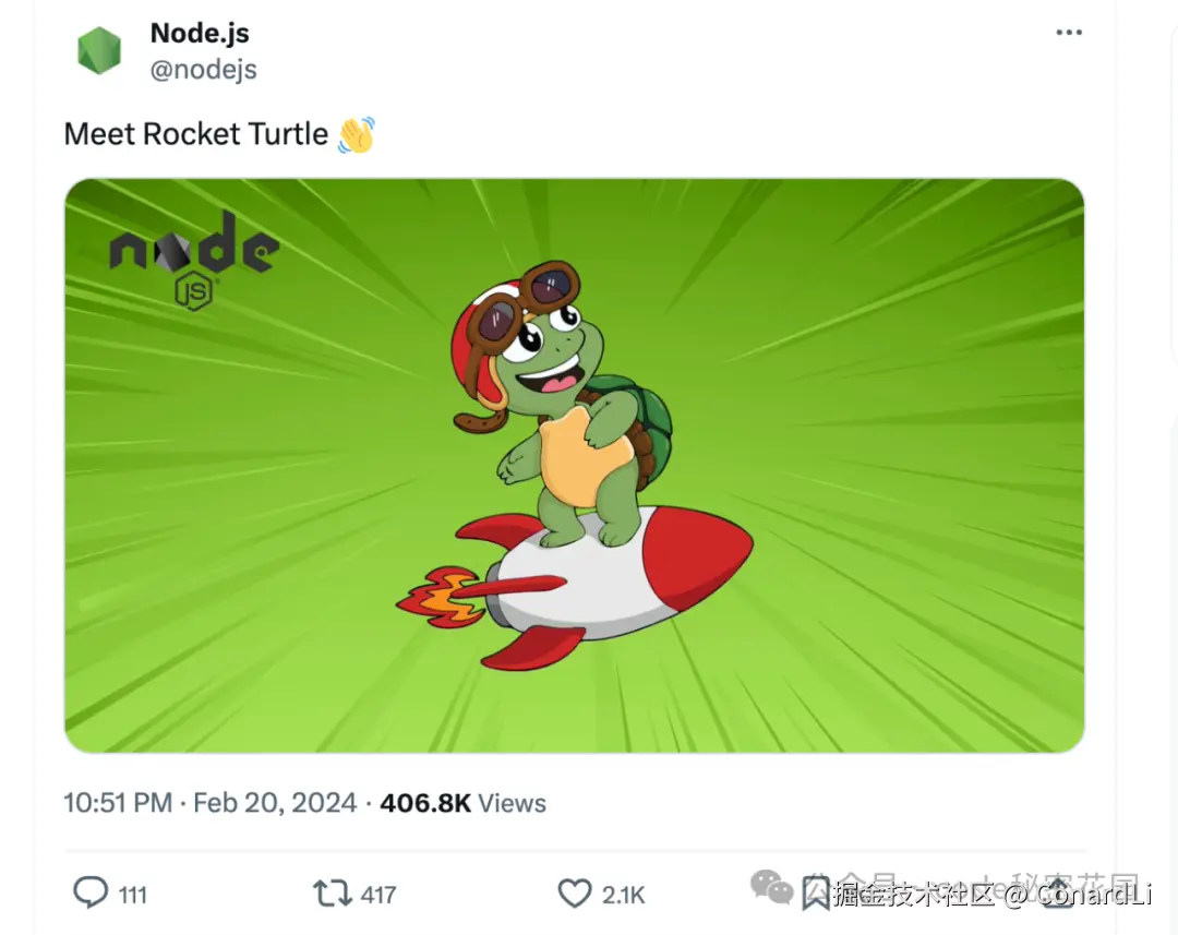 Node.js 自 2009 年诞生以来,一直没有属于它的吉祥物,在公开征集了大家的意见后,终于去推出了它的吉祥物:“火箭龟”。
