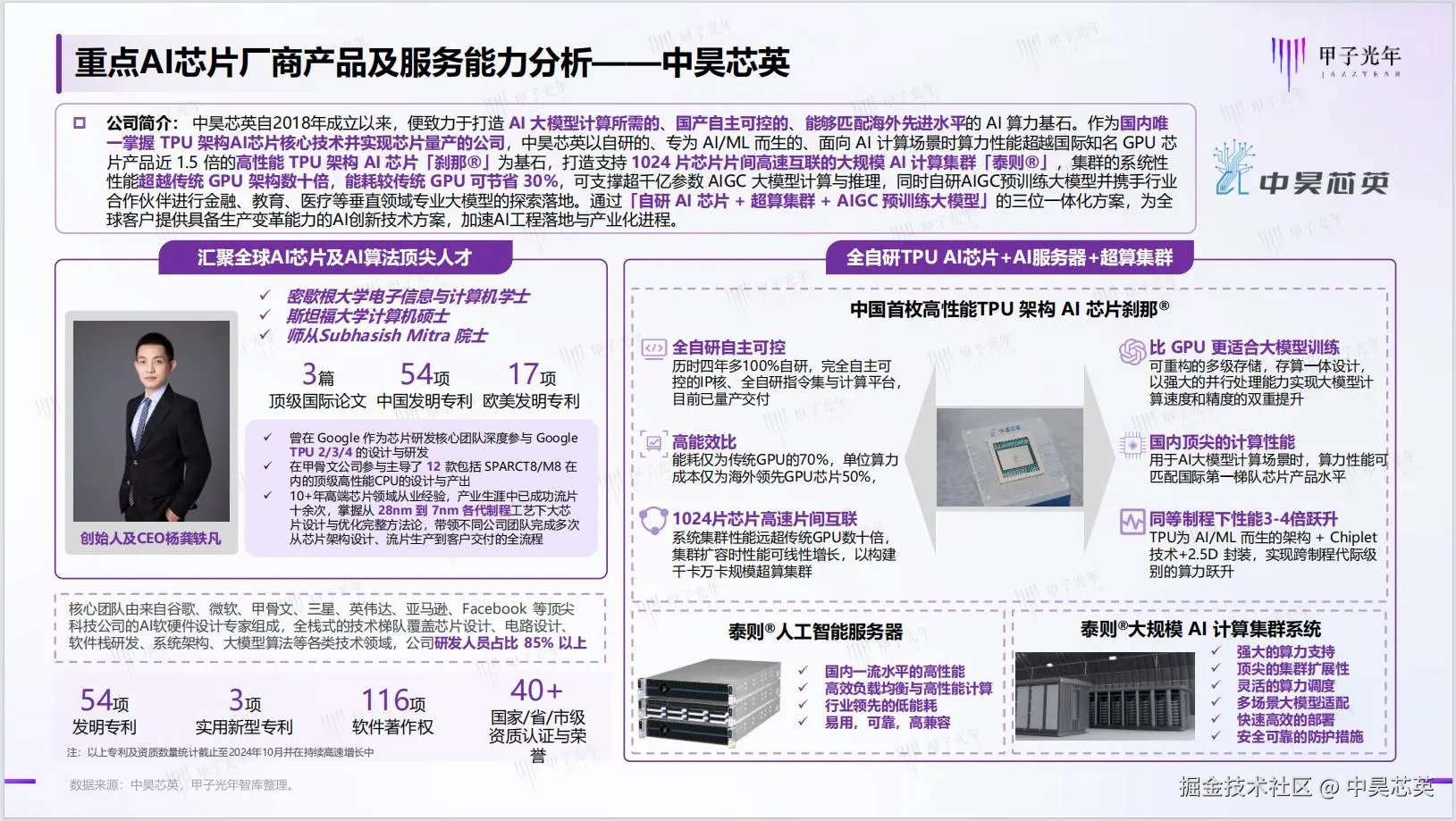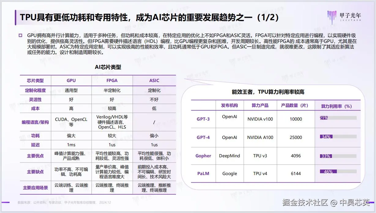 此外,该报告还重点分析以 Google 为代表的 TPU 自推出至今基于具有更低功耗和专用特性使算力利用率较高,作为能效王者,TPU 脱颖而出成为 AI 芯片的重要发展趋势之一。值得一提的是中昊芯英创始人杨龚轶凡曾在 Google 作为芯片研发核心团队深度参与了 Google TPU 2/3/4 的设计与研发,2018 年杨龚轶凡带领着一批来自 Google、Microsoft、Oracle 、Samsung 、Amazon 、Facebook 等海外顶尖科技公司的 AI 软硬件设计专家回国并创办了中昊芯英。历时近 5 年研发,中昊芯英的 TPU AI 芯片「刹那®」终于在 2023 年成功流片并实现量产。