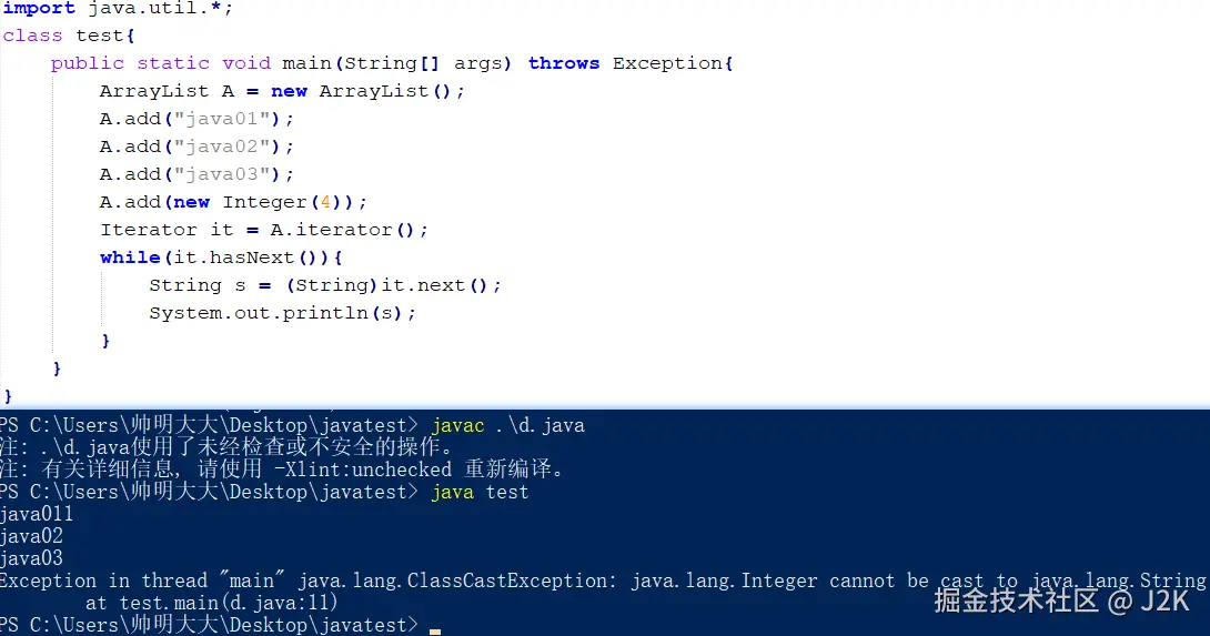 unsafeAdd方法接收一个原始的List,没有泛型约束,编译时允许向原本定义为List的集合里塞个整数进去。到运行时,获取元素并强转成String时,ClassCastException就抛出来了,代码直接 “翻车”,这就是擦除带来的类型安全 “暗坑”,稍不留意就会中招。