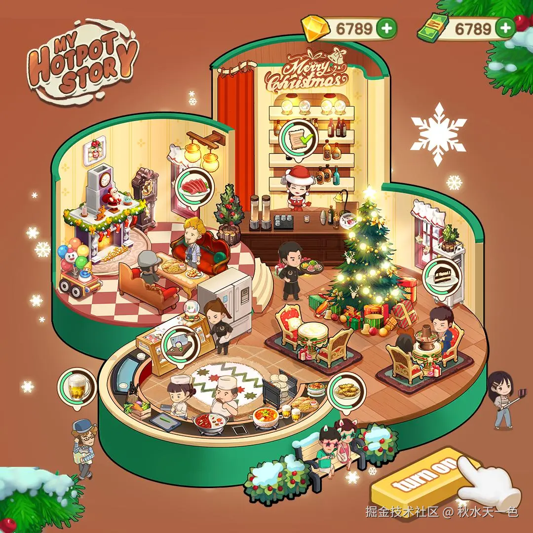 其中有一部分为新版本的素材投放,展示了全新的圣诞主题装潢背景,有趣的是,尽管背景洋溢着圣诞气氛,游戏中的NPC却穿着代表中华文化的春节服装,这种跨文化的节日融合给人一种梦幻联动的感觉,中式的大红旗袍给节日添多一分喜庆。