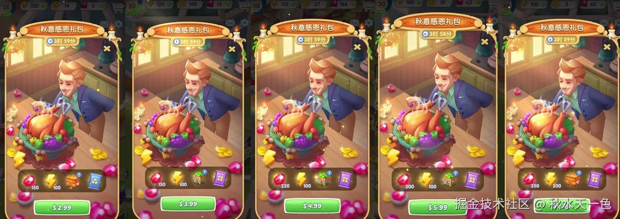 【Gossip Harbor】在此期间通过推出节日主题活动和促销策略,成功吸引了玩家的参与和消费,从而实现了收入的大幅增长,比如感恩季主题活动礼包、黑五主题活动礼包等。据资料显示,这类礼包在该游戏里出现频次很高,其中2.99美元档位的礼包因其高性价比以及对资源的有效供给,成为大多数微氪玩家的首选。