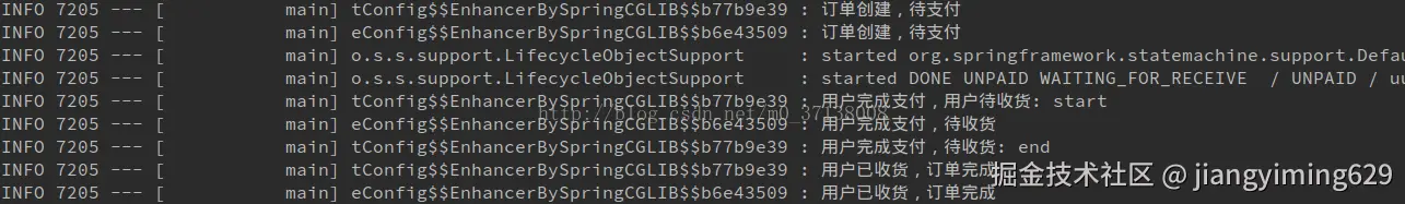 在run函数中,我们定义了整个流程的处理过程,其中start()就是创建这个订单流程,根据之前的定义,该订单会处于待支付状态,然后通过调用sendEvent(Events.PAY)执行支付操作,最后通过掉用sendEvent(Events.RECEIVE)来完成收货操作。在运行了上述程序之后,我们可以在控制台中获得类似下面的输出内容: