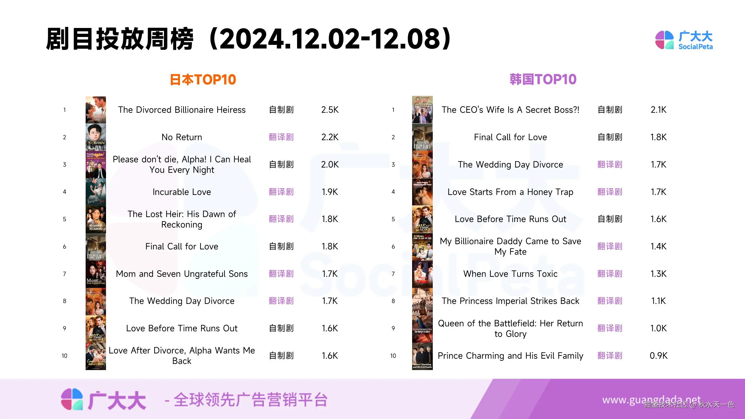 日本地区方面,老短剧《The Divorced Billionaire Heiress》登顶,该剧集曾2次等上总榜月榜TOP3。而专门针对日本地区制作的短剧,上周暂时没有出现在TOP10,相比欧美地区的竞争比较缓和。总体来看,翻译剧和自制剧的占比呈现五五开的局面。