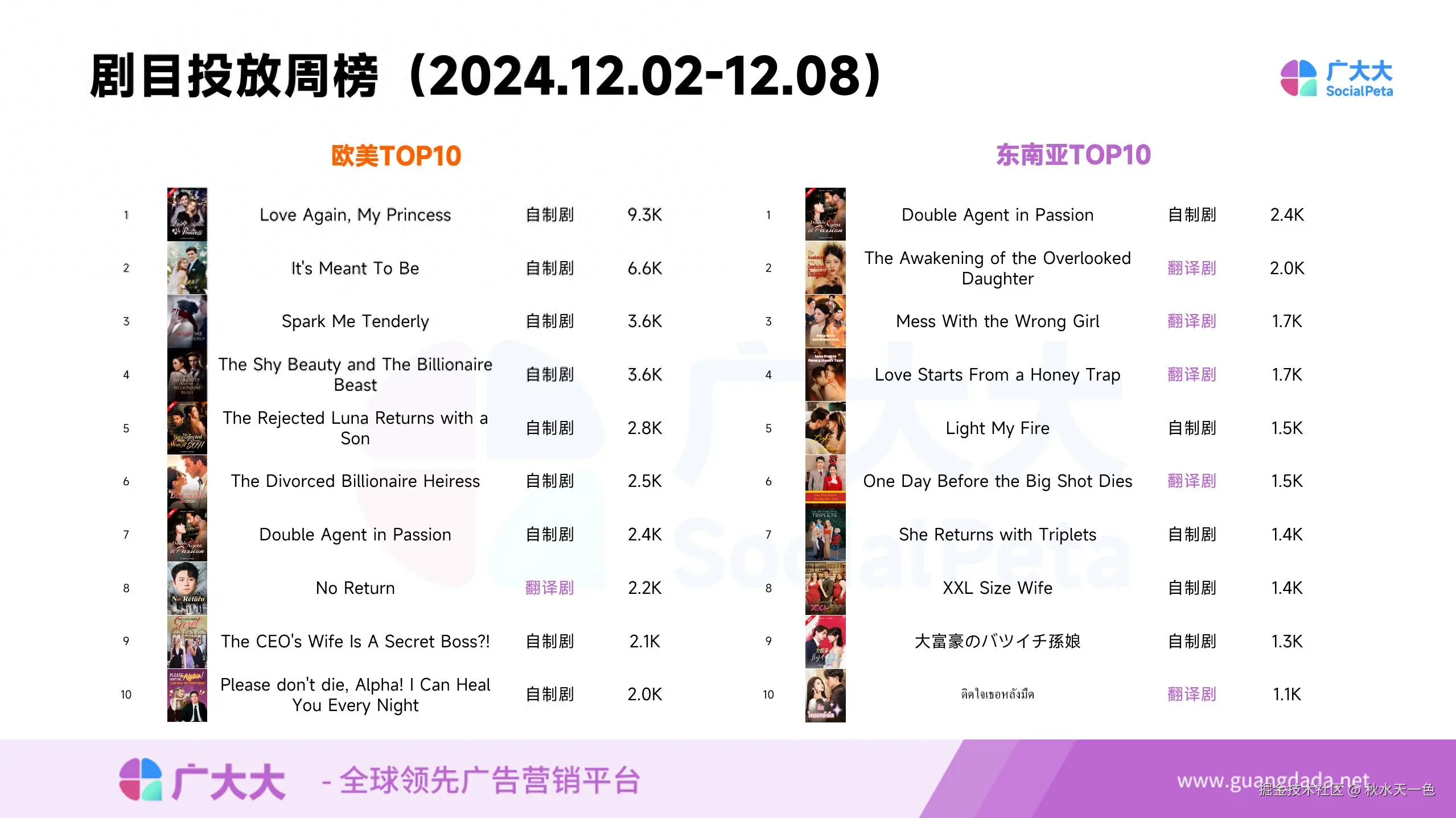 不过东南亚地区的短剧本就更新频率较低,因地制宜的投放策略也许更加适合。除此之外,该地区的翻译剧占比也比较高,上周TOP10中50%的剧集都是翻译剧。