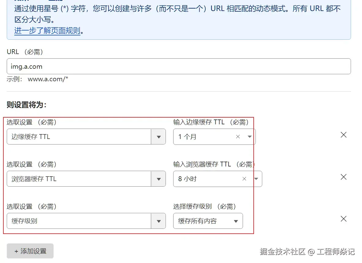 添加设置:边缘缓存 TTL – 一个月(图片内容只有存在或者删除两个状态,所以越长越好)