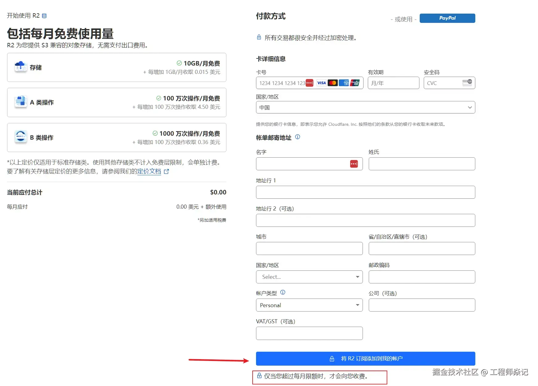 CLoudFlare R2 免费用户有10GB/月的存储额度(30天内每天储存峰值的平均值),对于小网站基本足够,超额的存储是$0.015/GB/月,
