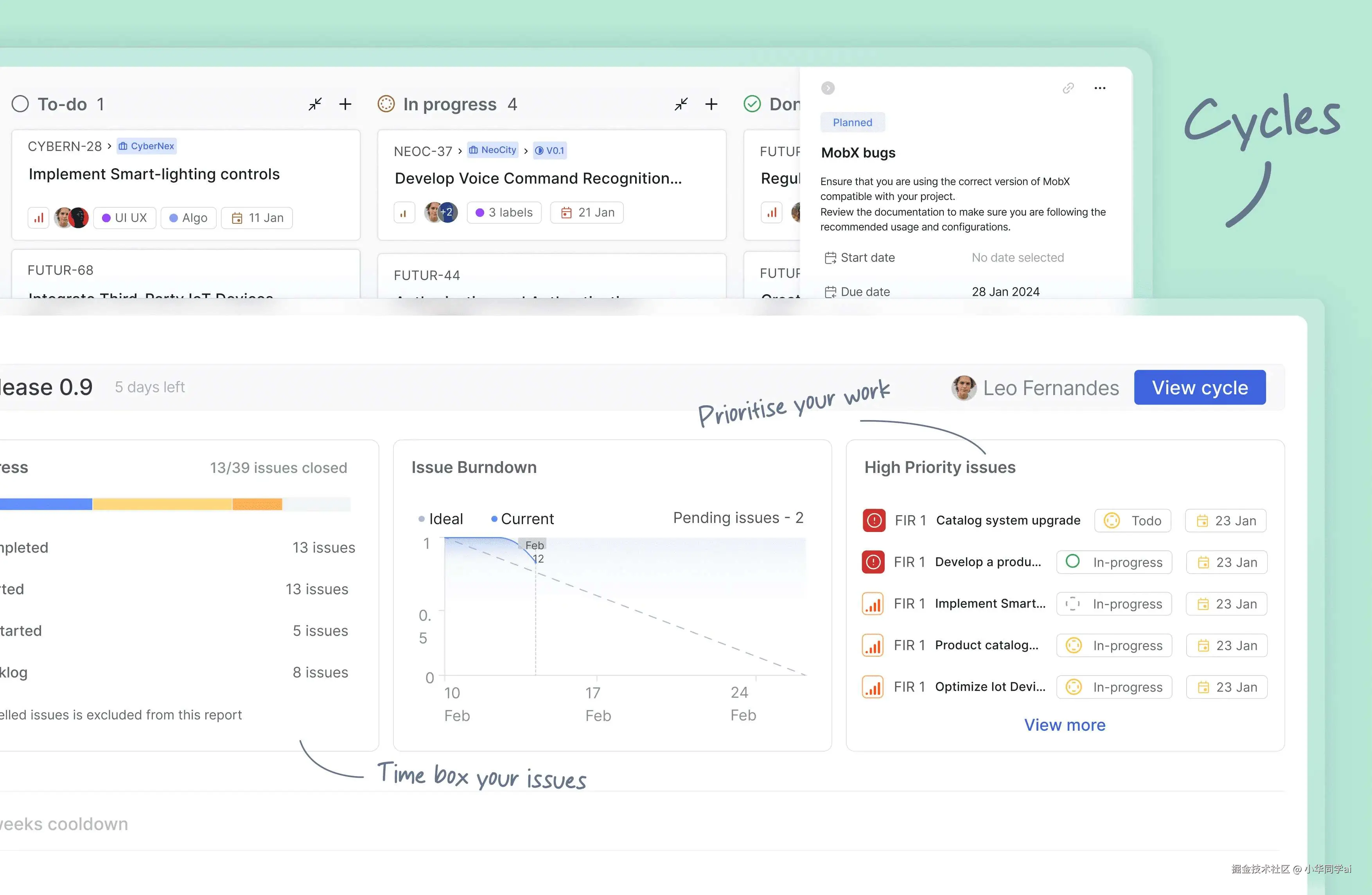 - 周期管理:通过周期,团队可以保持动力和节奏,轻松跟踪进度,使用燃烧图等工具查看项目状态。