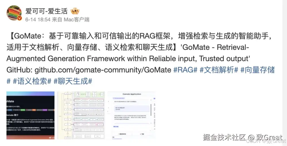 当时国内开始出现一些比较欢迎的项目,我印象里是一个是网易的QAnything,之后是Infiniflow的ragflow,之后国内有很多开源的RAG框架,比如haystack、升级之后的Langchain等。TrustRAG改名之前叫GoMate,在6月份受到爱可可博主的关注转发,还是很幸运的!