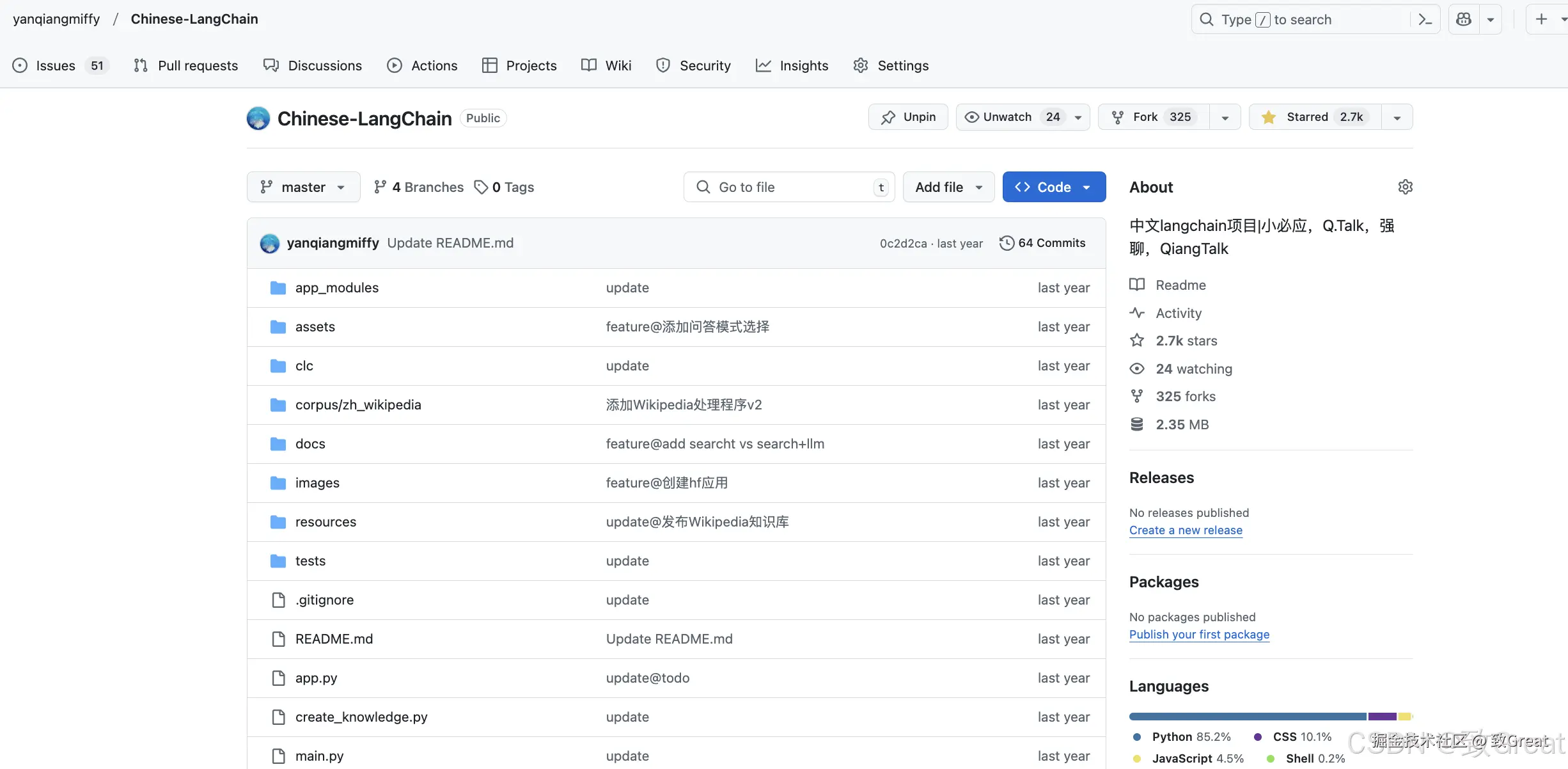 在2023年末,当时LLM概念盛行,RAG技术开始展露头脚,机缘巧合下笔者参加了一个线下黑客马拉松的活动,我在大约一天时间内开发了Chinese-LangChain项目,在Github进行了开源,当时收到了朋友圈和社区的关注,可谓捷足先登,在短时间内收获了2.7k累计的Star。