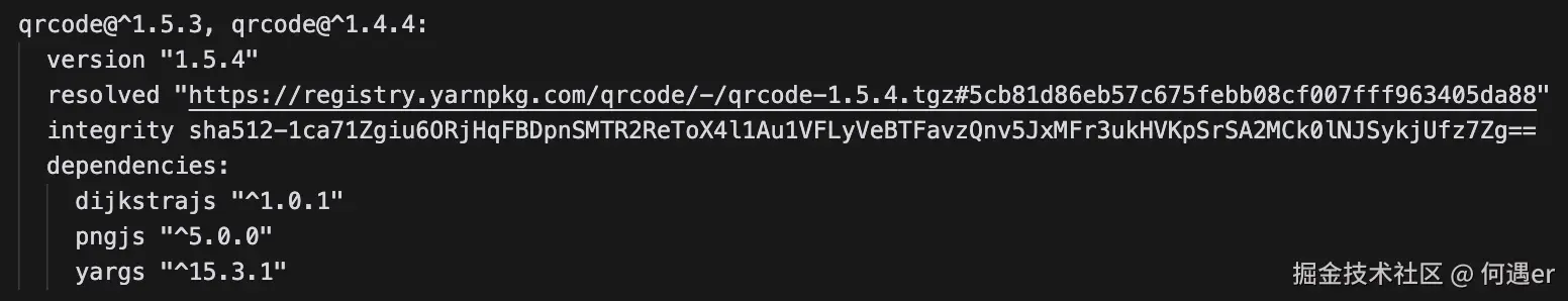 - version "1.5.4":yarn 最终下载的版本是 1.5.4,这是发生线上故障前夕 qrcode 的最新版本,1.5.4 能满足 ^1.5.3 和 ^1.4.4 的版本要求
