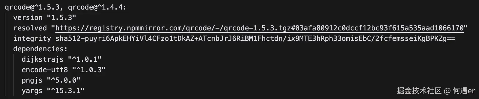- qrcode@^1.5.3, qrcode@^1.4.4:表明本项目对 qrcode 有两个版本要求,qrcode@^1.5.3 写在钉钉小程序项目的package.json 中,qrcode@^1.4.4 是 dingtalk-miniapp-opensdk 的依赖。