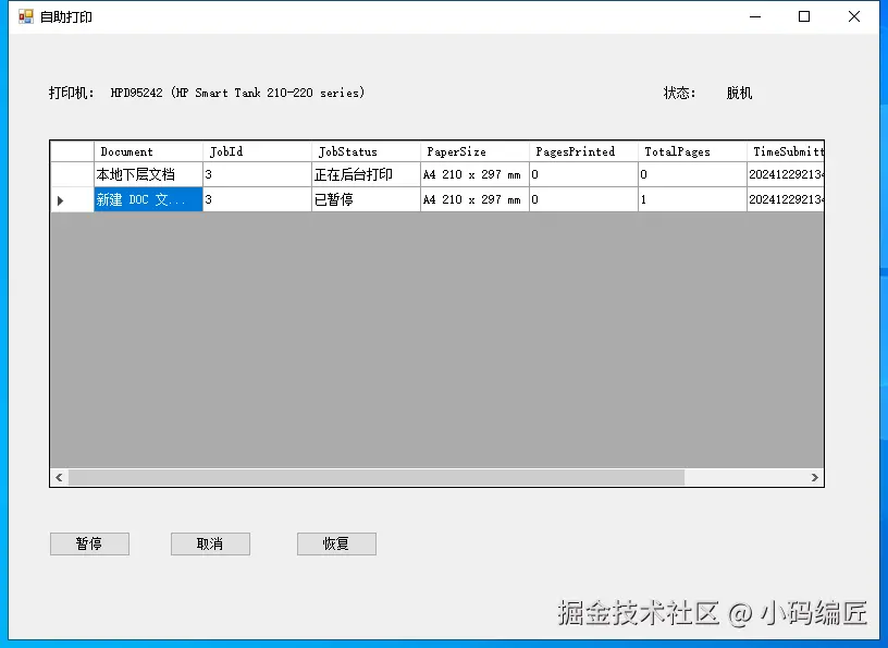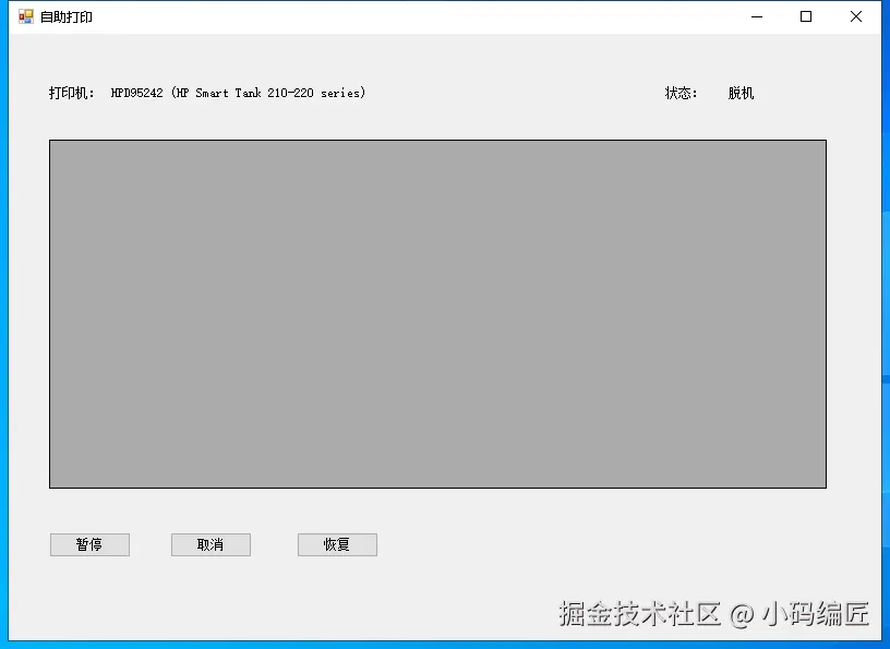 主要功能时时监控电脑端打印任务、打印纸张数,最后计算出打印费用;这次我们先实现打印任务监控。有兴趣的小伙伴们可以一起学习。