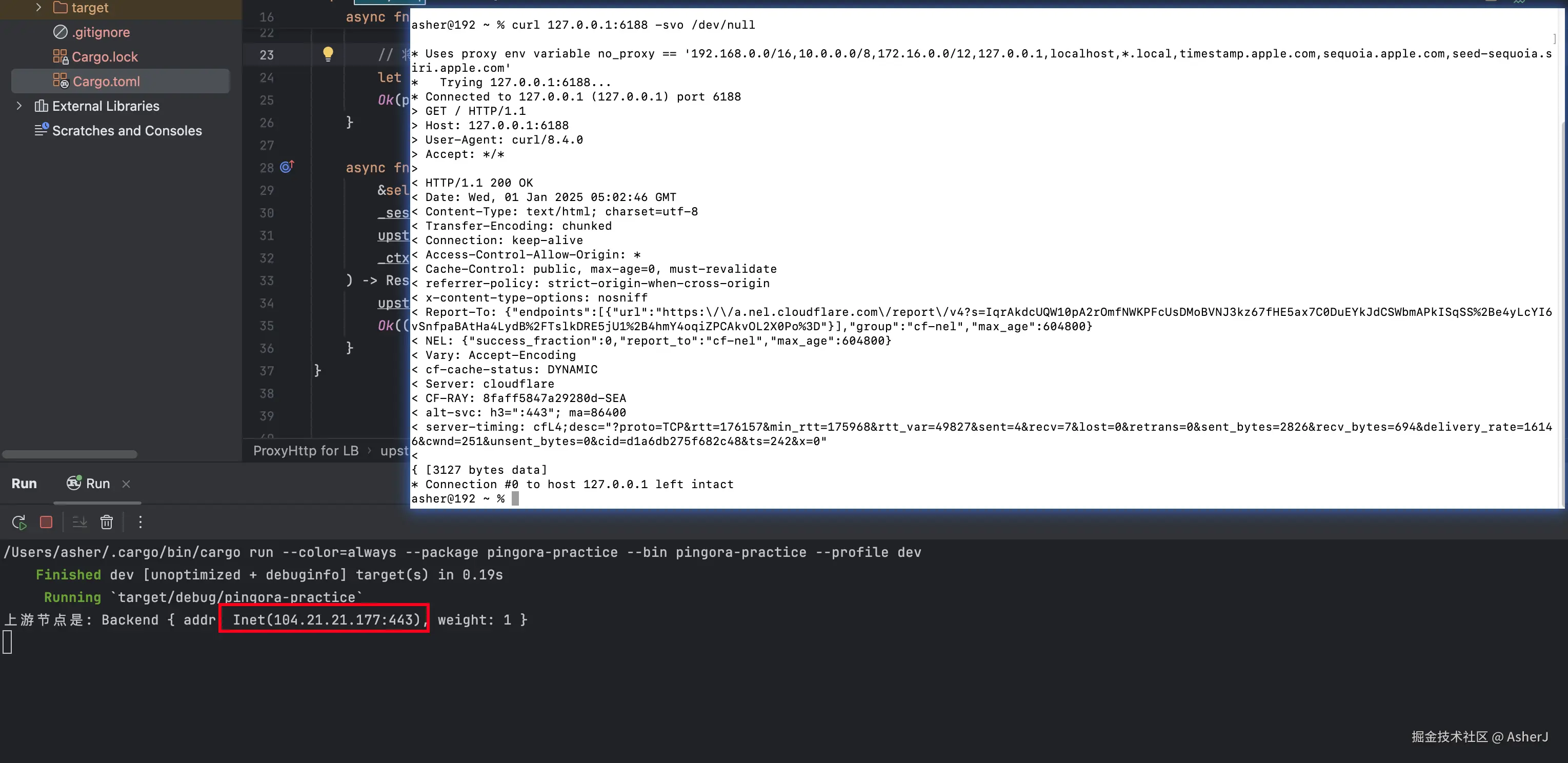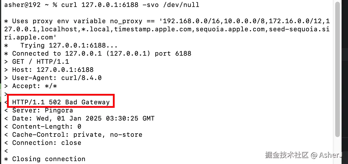 curl:这是一个命令行工具,用于发起 HTTP 请求。127.0.0.1:6188:指的是发起请求的目标地址,即本地代理服务器运行的地址(127.0.0.1 表示本地主机,6188 是你的代码中代理服务监听的端口)。-s:代表 “silent” 模式,隐藏进度条和错误信息,除非有严重错误时才会显示。一般用于安静地测试或调试,不输出太多干扰信息。-v:代表 “verbose” 模式,会显示详细的请求和响应头信息,包括连接的详细过程,比如发送的请求、返回的响应、重定向情况等。这个可以帮助分析请求的完整细节,验证代理的行为。-o /dev/null:将输出结果重定向到 /dev/null,即丢弃所有响应的内容,不把请求的响应内容保存到文件或屏幕上。这是为了仅关注请求和响应的头信息,而不关心实际返回的页面内容。-svo结合起来的意思:既静默执行(没有额外的进度条和错误信息输出),又在 verbose 模式下展示详细的请求和响应头信息,同时将响应的正文内容丢弃。