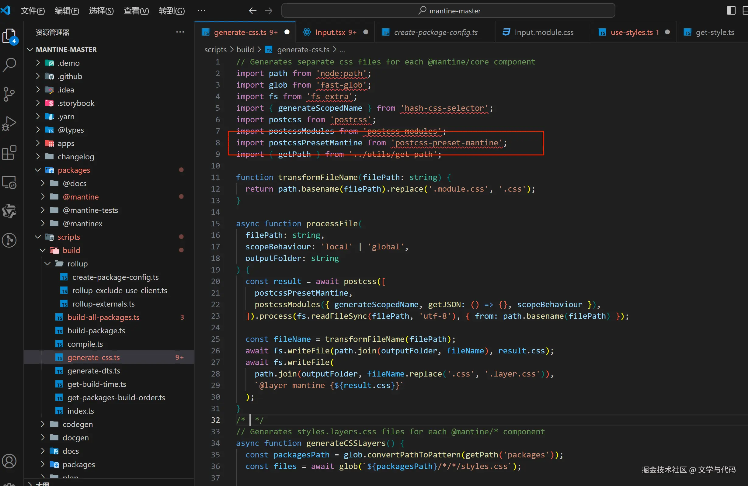 - 因为目前的rollup打包并不会生成最终的 css 样式文件,所以 Mantine-ui 还会自定义一个 css 生成脚本,通过执行这个脚本来,调用 postcss 以及它的插件来编译生成最终的css文件。