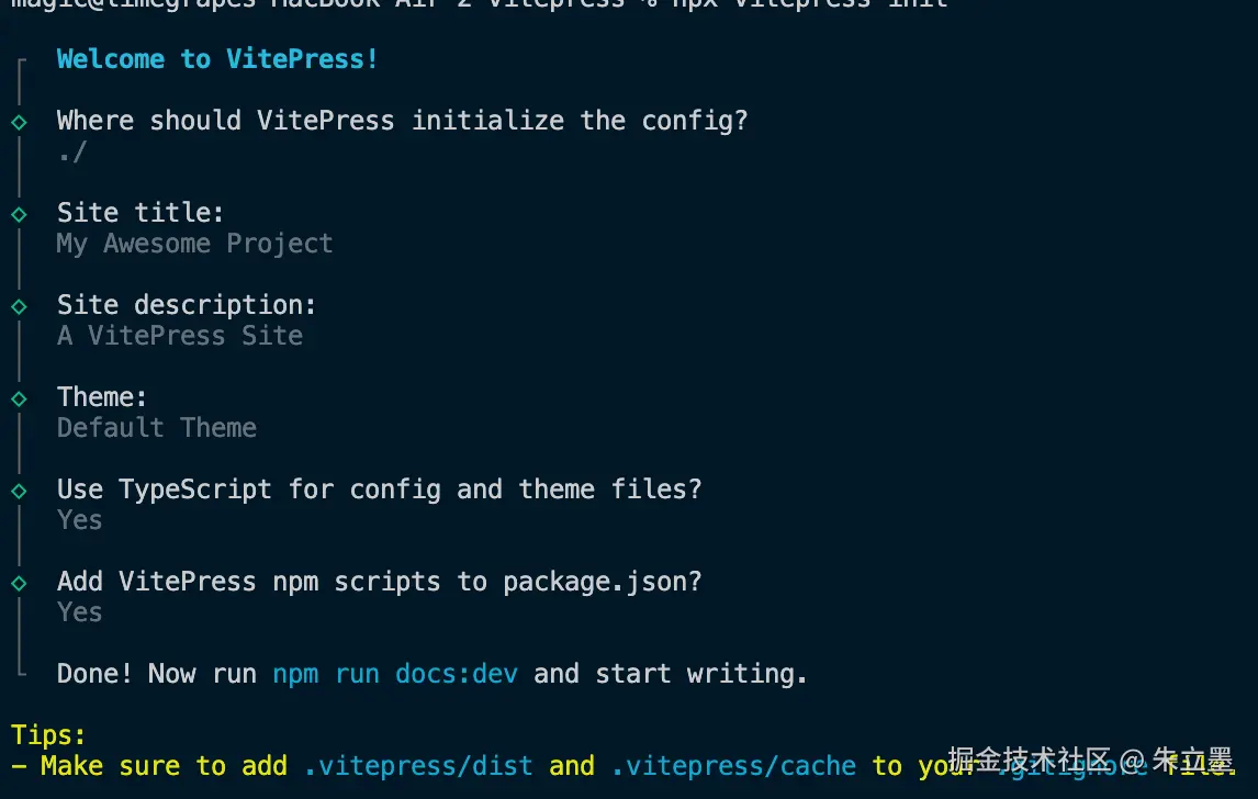 在终端输入npx vitepress init,一路回车默认配置,快速生成package.json文件