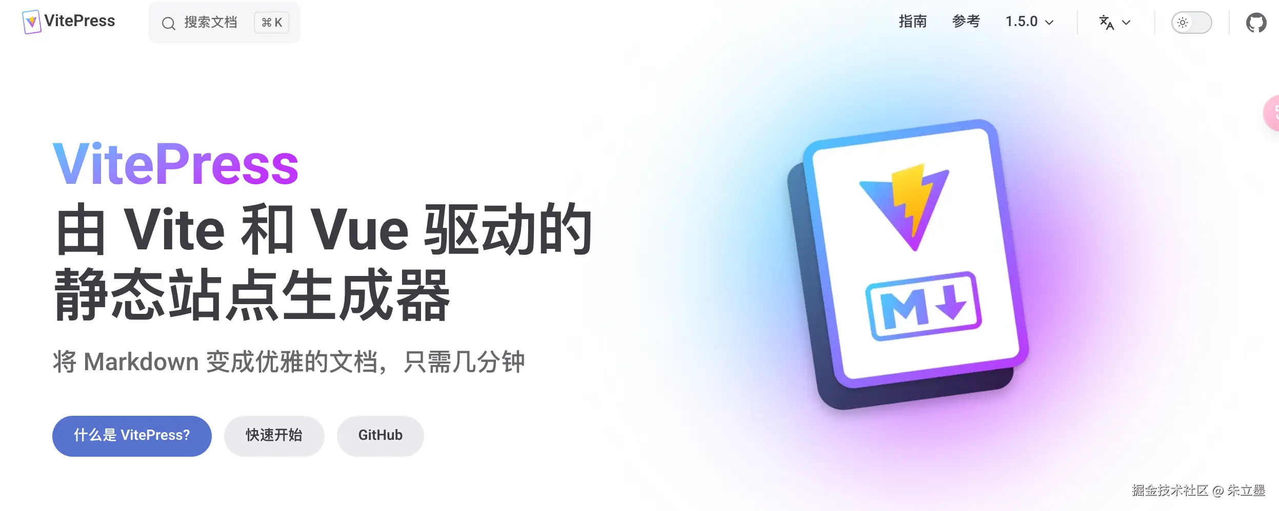 VitePress 是一个基于 Vite 和 Vue 的静态网站生成器(SSG),专为构建快速、以内容为中心的站点而设计。能把你用 Markdown 编写的源内容应用上主题样式,快速生成可以部署到任何地方的静态 HTML 页面。