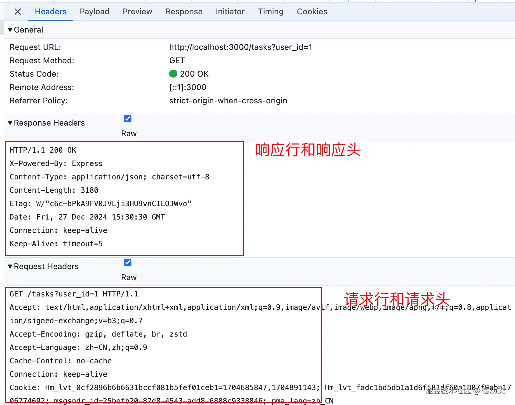 打开浏览器的network面板,点击一个请求,可以看到状态行和响应头: