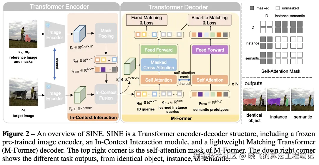 SINE基于经典的Transformer结构,引入了一些针对上下文分割任务的有效设计,包括一个冻结的预训练图像编码器、一个上下文交互模块和一个轻量级匹配Transformer (M-Former) 解码器。