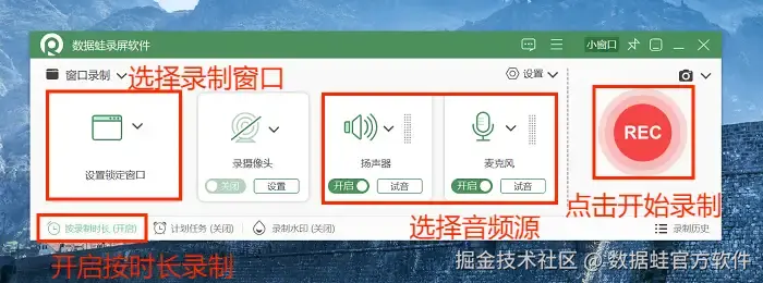 步骤2:选择合适的录制模式后,我们就可以选择需要录制的窗口区域和音频源了。如果有需要,还可以点击开启按时长录制。全部搞定后,就可以点击“REC”去录制视频了。