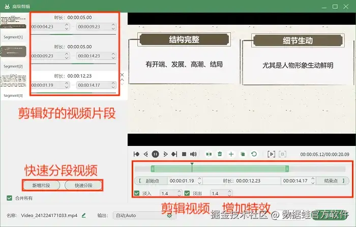 步骤3:录制结束后,我们还可以在预览页面找到“高级剪辑”工具,使用它对视频进行后期编辑操作。如快速分段视频、剪辑需要的视频片段等。