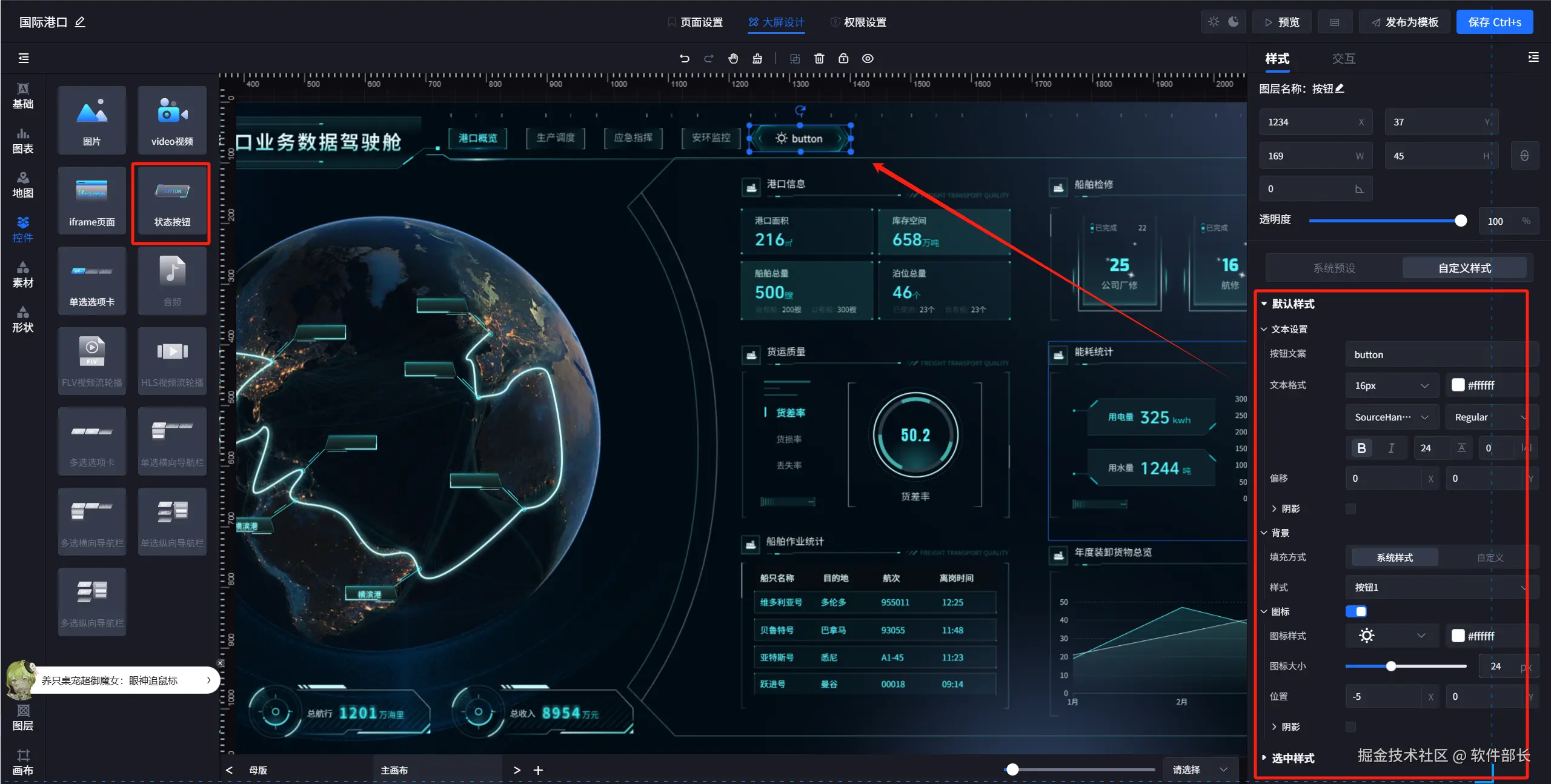 2、大屏控件组件—状态按钮组件,将样式进一步优化。可分为系统预设和自定义样式两种。其中自定义样式里有对状态按钮的文本格式、阴影等设置。还有对按钮背景样式和图标样式大小以及位置阴影的设置。此外还新加了选中该状态按钮时的样式设置,用于区分选中和未选中。