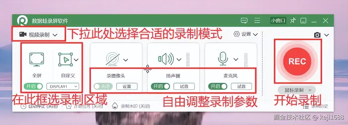 步骤1:打开软件后,选择所需的录制模式(如视频录制)。调整录制区域、音频输入、摄像头等参数。