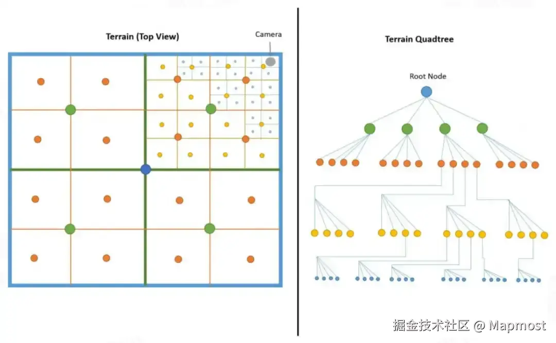 渲染地形时,如果采用固定地形精度等级,则会随着地形面积的增大,渲染的三角形数量会随着面积的增大而增长。现代游戏引擎更多的采用基于四叉树的地形表达,可把地形不在视野内的网格去掉,有效降低程序的时间复杂度。