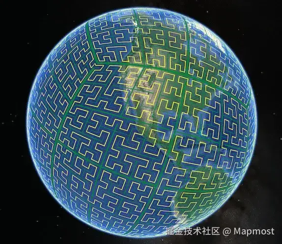 黄色曲线是近似的 S2 空间填充曲线,它是一个具有连续重复结构的分形图形,其可以无限细分,甚至细分到可以经过球表面上的任意一点。绿线显示 S2 单元在 0、1、2、3、4 和 5 级的边界,以不同宽度的线条绘制。每一级上的单元编号沿着该曲线递增,这就使得S2单元编码具有以下属性:如果两个单元的 S2编码靠得很近,那么这些单元在空间上也靠得很近。当单元用于索引时,此属性可显著改善引用局部性。