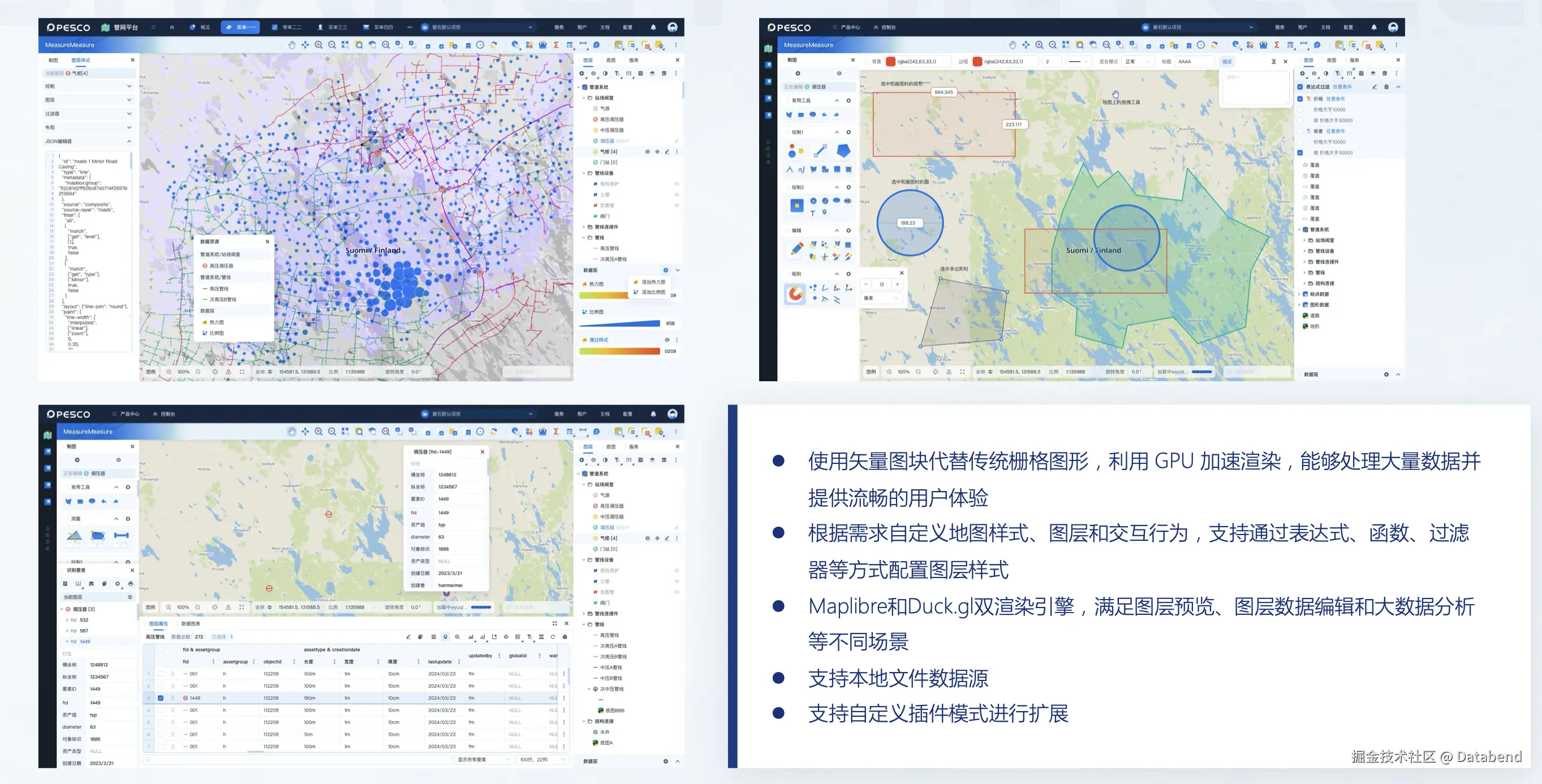 使用了最新的 WebGL 高性能渲染+本地 GIS 制图表达空间展示的技术栈。