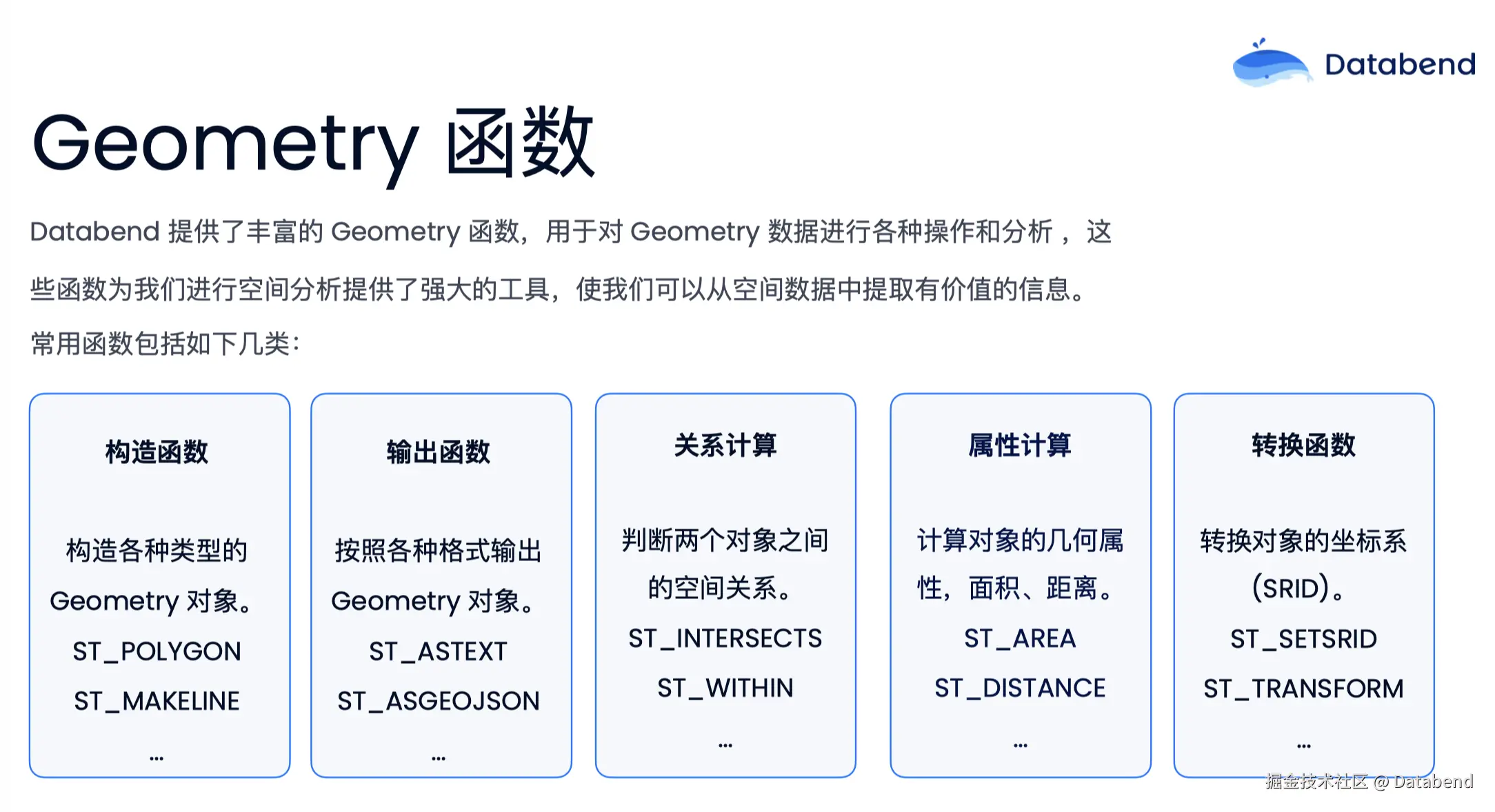 数据库是地理空间系统中的核心组成部分,负责存储和分析地理数据。没有高效的空间数据库,地理信息系统就无法发挥其强大的空间分析和可视化能力。Databend 在 11 月份的最新更新中,新增了对地理空间数据类型 Geometry 和 Geography 的支持,并提供丰富的空间函数,可以满足处理空间数据分析的各种需求。