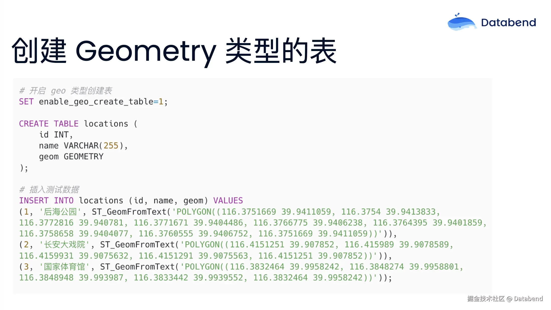 目前,在 Databend 内地理信息类型数据还是一个实验性质的功能,所以在使用之前需要使用 enable_geo_create_ table 打开配置,才可以在建表时使用这个数据类型。我们先建一个 location 的表,然后插入一些测试的数据。