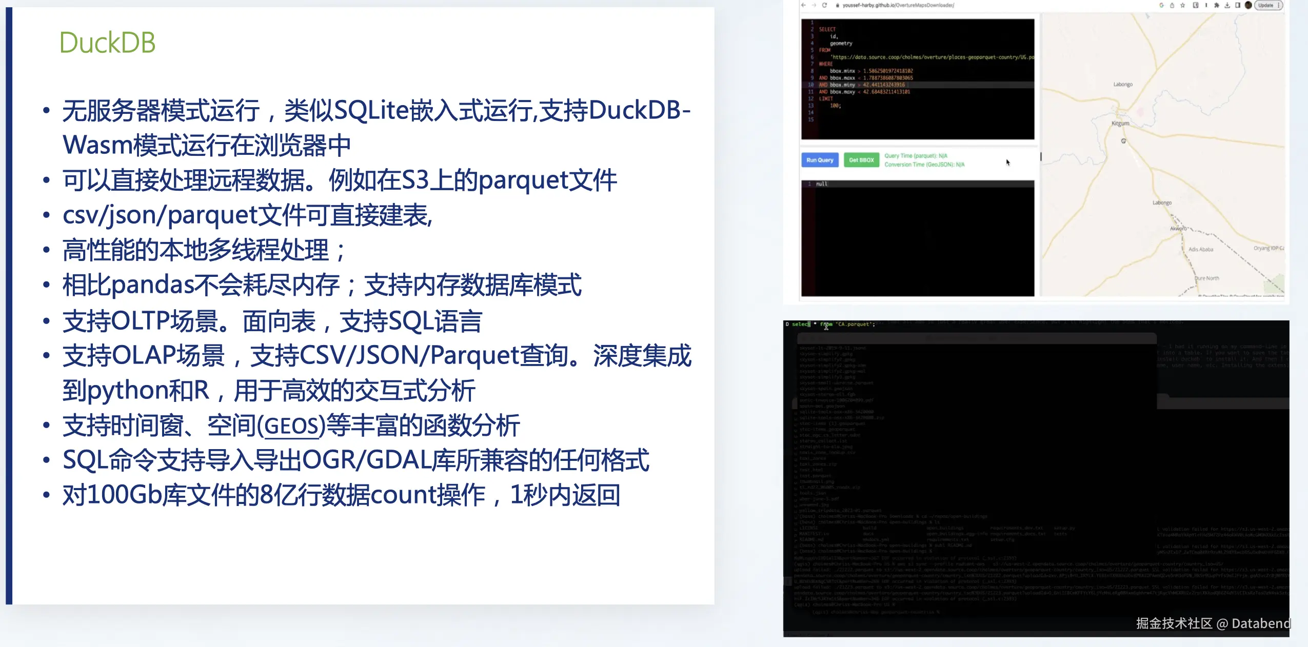 DuckDB 是近几年比较火的数据库,可以做一些 OLAP 分析,它的分析能力比较强,性能非常高。它可以在浏览器端使用,可以直接读取 S3 或其他平台的数据。同时,它对于时间窗口函数或空间函数支持程度非常高。
