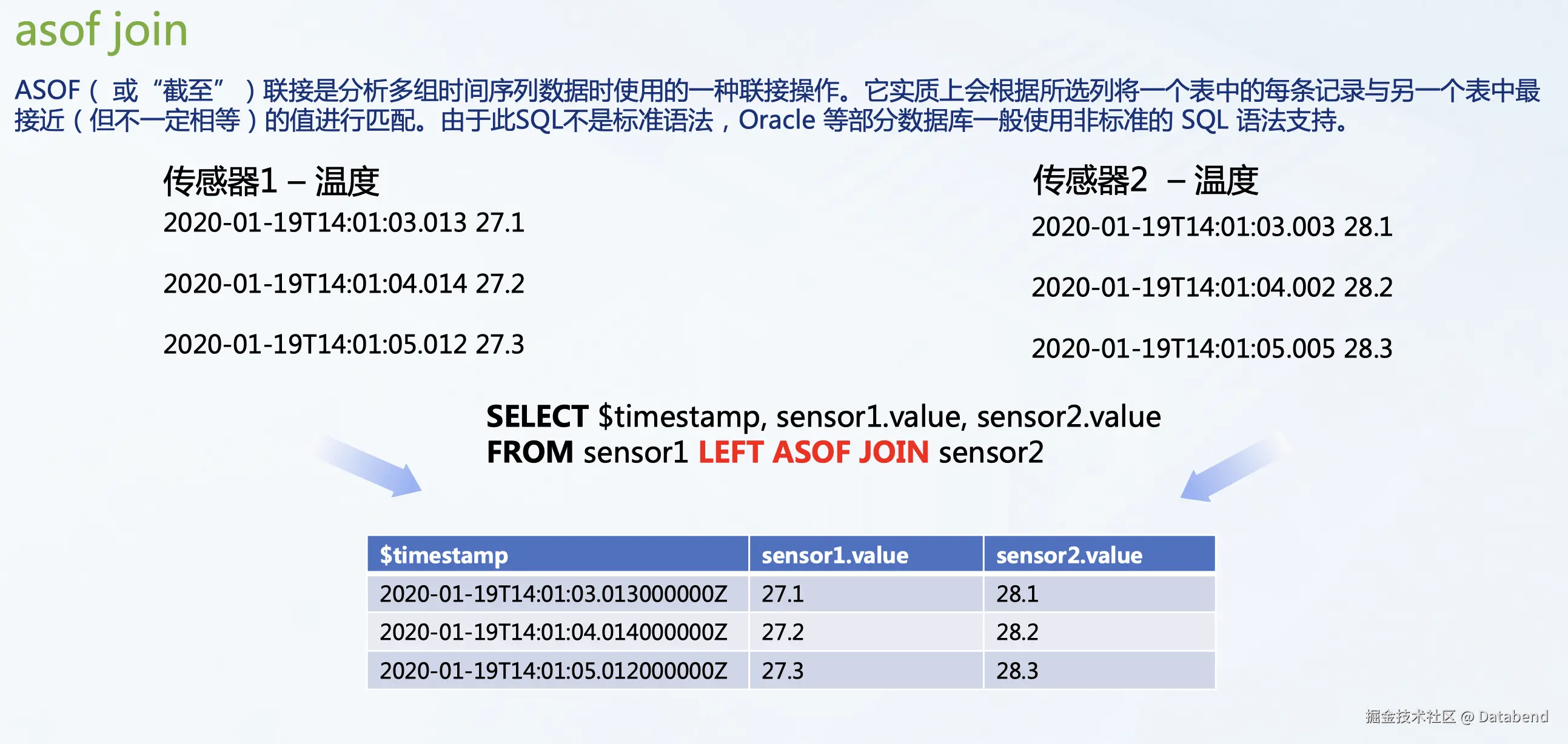 ASOF 也可以称作截止关联,它的作用是找对应基准时间相邻的最近一个数据。在一个真实生产场景里,有很多传感器,我们不可能保证每个传感器都在相同时间内发来数据。它会有相同的时间频度间隔,但是说因为传感器可能内置的启动时间不一样,内置的时钟不一样,导致它发送过来的时间都会有轻微的偏差。用 ASOF 语义,相当于定义好一个基准时间,然后找每一个传感器与这个基准时间相邻范围内最近的时间,作为标准参考值。