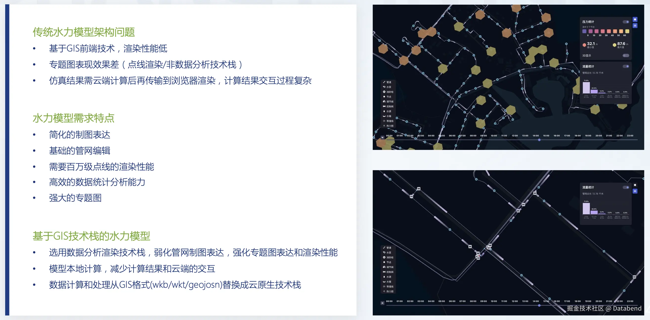 基于旧的水力模型架构存在很多弊端,如仿真数据需要在云端计算之后再在浏览器上做渲染,交互比较复杂。且由于基于旧的 GIS 前端技术,渲染率性能较差;基于新版 GIS 技术栈做调整后,满足了水力模型新的需求,如简化的制图表达,基础的官网编辑,弱化了一些不必要的元素(如建筑物),提高了专题图表达和渲染性能,百万级别点线的渲染能力,高效实时的数据统计分析能力。新版 GIS 技术栈将整个管网模型做了本地化,减少了计算结果与云端的交互,显示速度快了很多。同时将数据计算和处理,从 GIS 格式(wkb/wkt/geojson)转换成云原生技术栈,提升了整体管网模型效率。