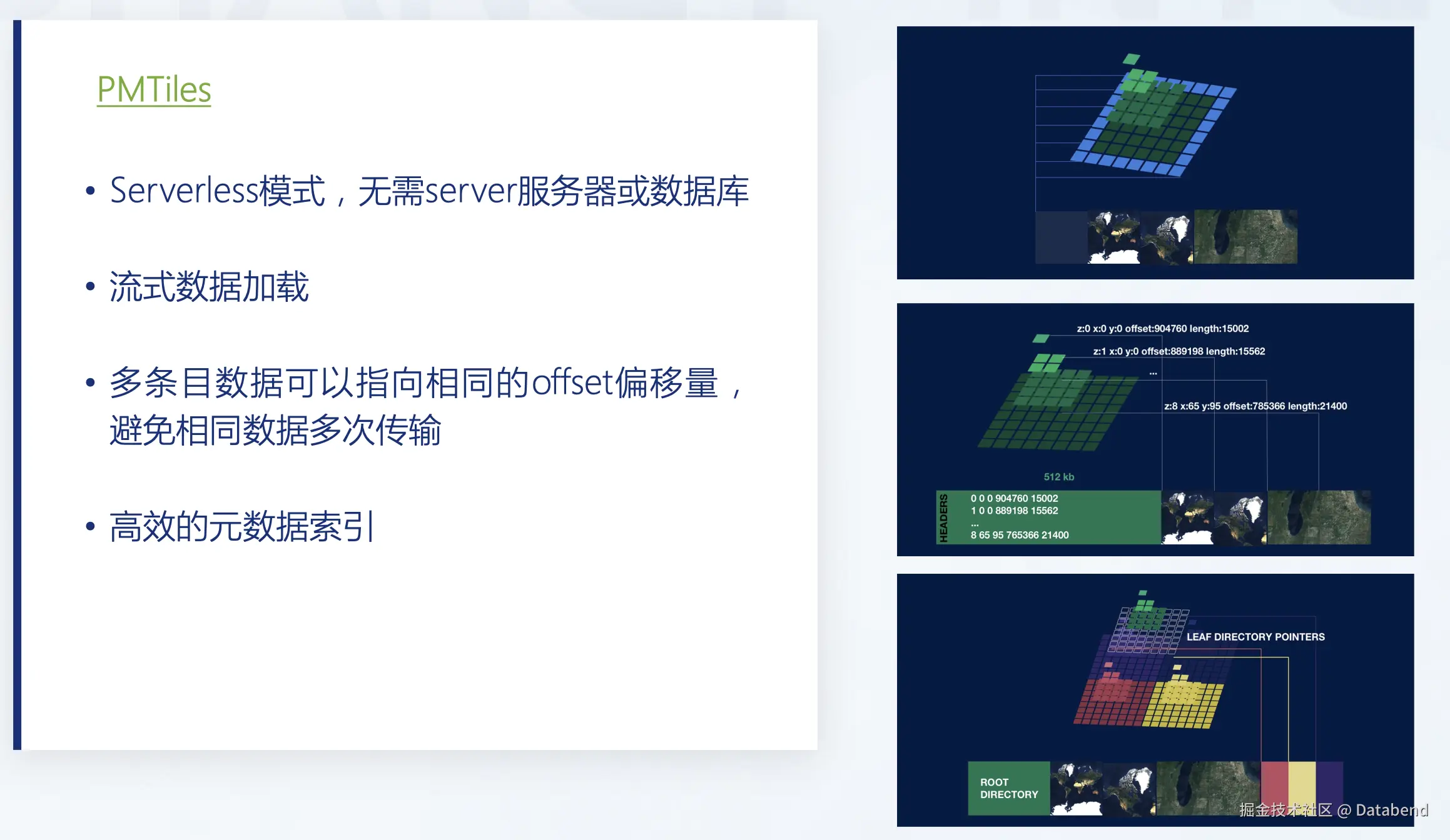 PMTiles 是一个 Serverless 的空间加载技术,可以做流式数据加载。我们把空间数据文件或多条目数据放在云存储上后,它可以基于所要定位的空间区域,按照 offset 偏移量去加载内部的一份数据,可以避免整体的数据传输。在传统的 GIS 方案里,通常会把整体数据加载到内存里或浏览器里展现,速度会很慢。