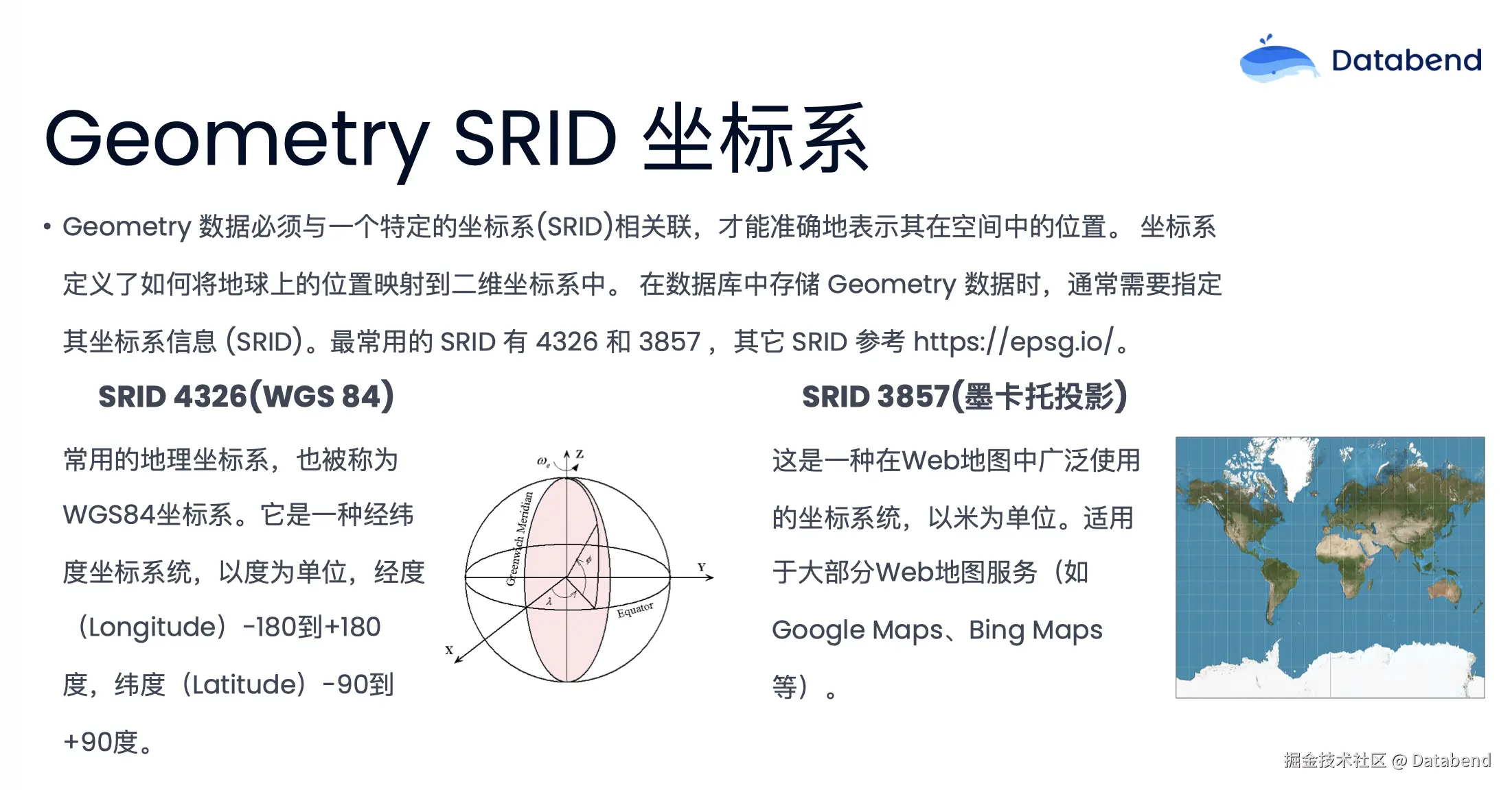 Geometry SRID 坐标系是 GMT 类型,它是一个 x,y 的坐标,只有在一定的坐标系中才能展示真正的实际位置。我们常用的坐标有 4326 和 3857。4326 就是 WGS 84 的坐标,它是一种经纬度坐标系,经度是负 180 度到正 180 度,纬度是负 90 度到正 90 度,通常 GPS 就会使用这个坐标;3857 是墨托卡莫卡托投影,会把地图由球面映射成一个平面。它是在地图中广泛使用的一种坐标系,单位是米。