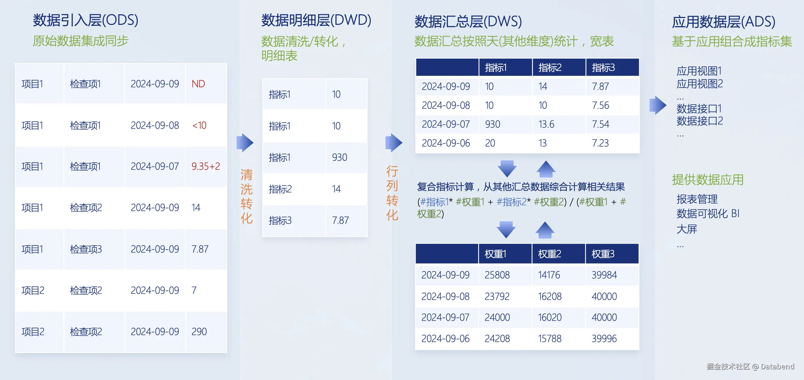 - 一些关键指标需要结合外部数据进行加权计算。团队通过复合指标模型完成计算,并将结果更新至汇总层。