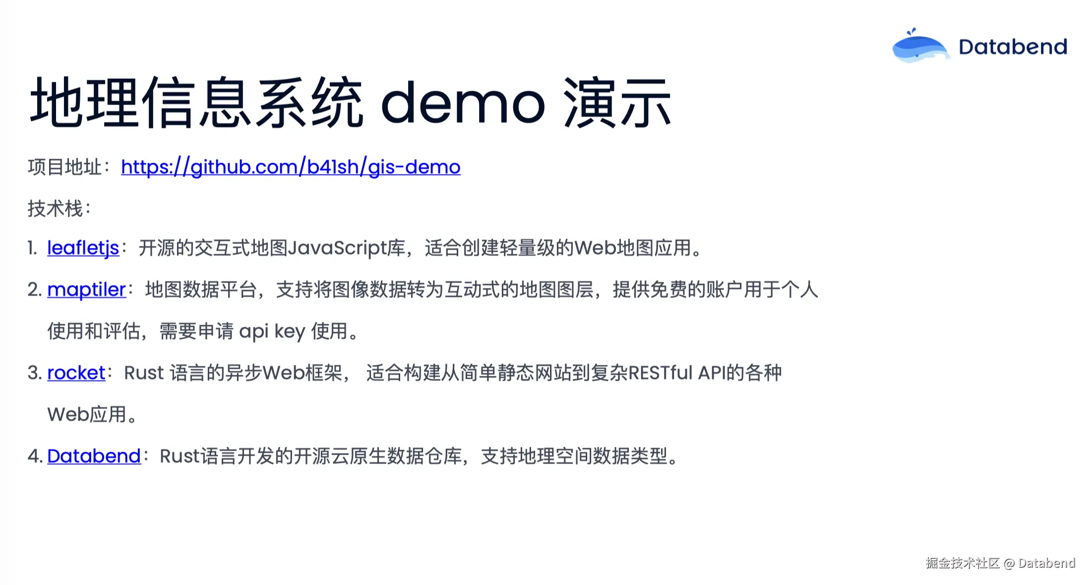 这里写了一个小的 demo,已经开源在 Github 上。里面用到的技术栈有 leafletjs(一个前端的地图 JS 库),比较适合于创建轻量级的外部地图应用。地图数据使用了 maptiler,Web 框架用了 rocket,数据仓库是 Databend。大家如果感兴趣可以在 GitHub 上查看相关代码。