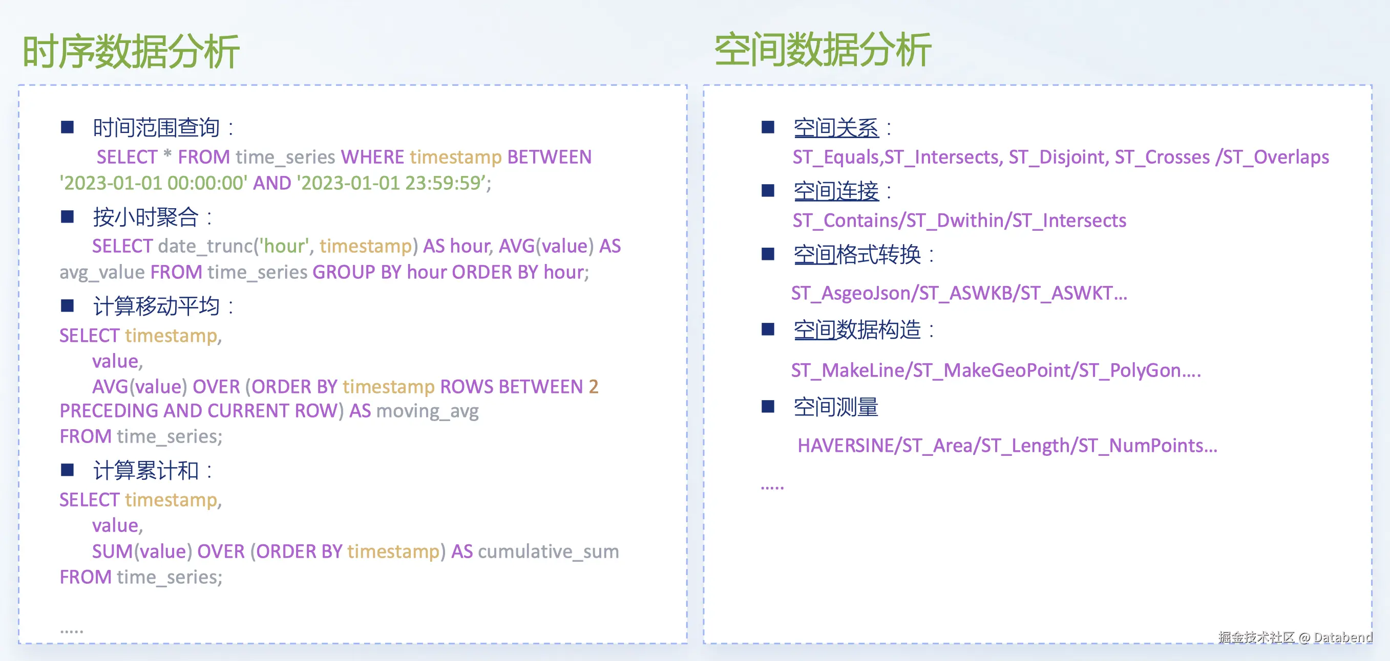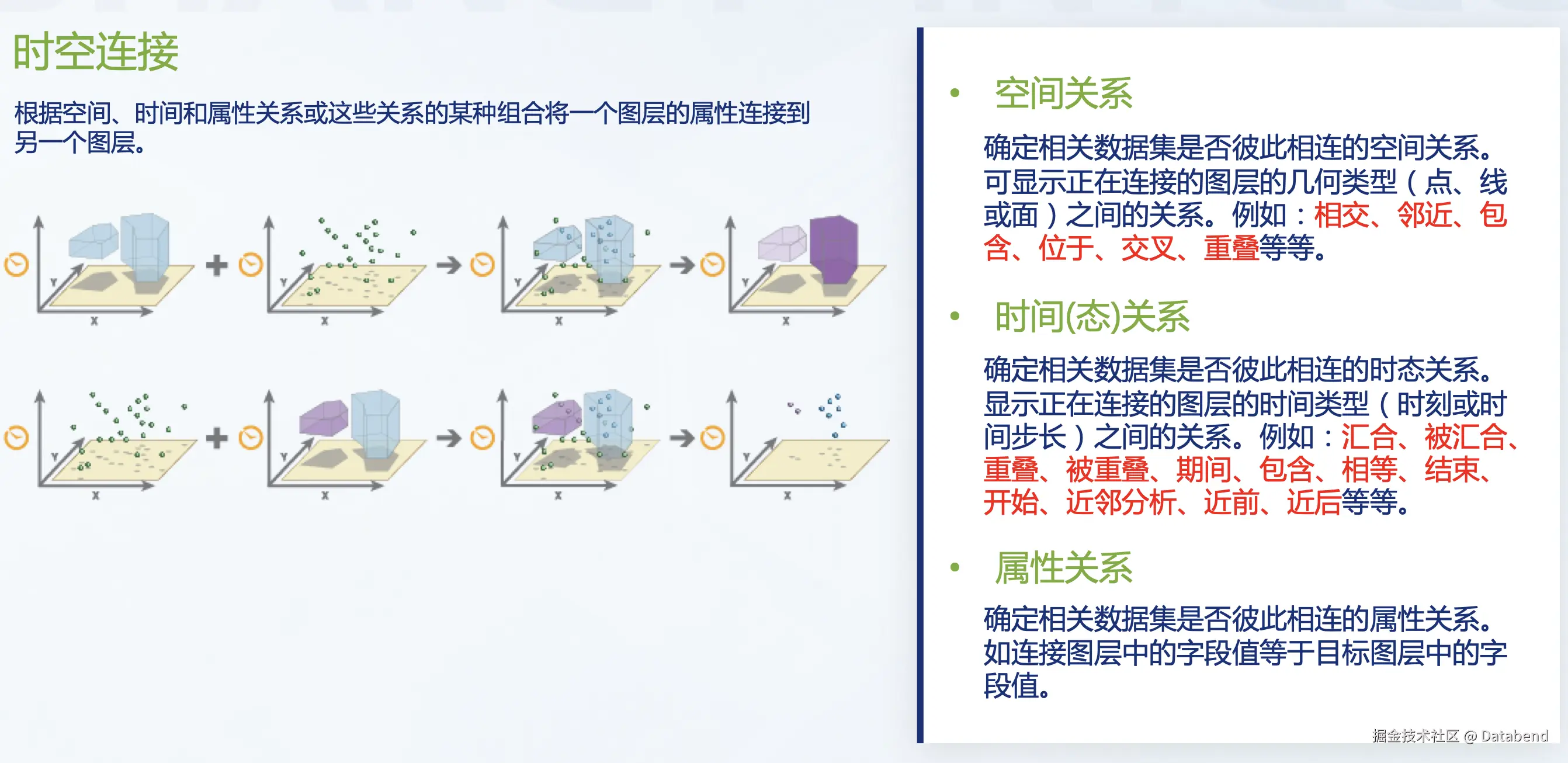 上图左边的是时序数据分析,比如按时间查询,按窗口函数处理;右边是空间数据分析,有一些空间数据分析函数。例如空间关系有一些相交临近,如点线面之间的关系情况。时态的关系是本身的空间数据与时间对比,是相邻,还是包含。