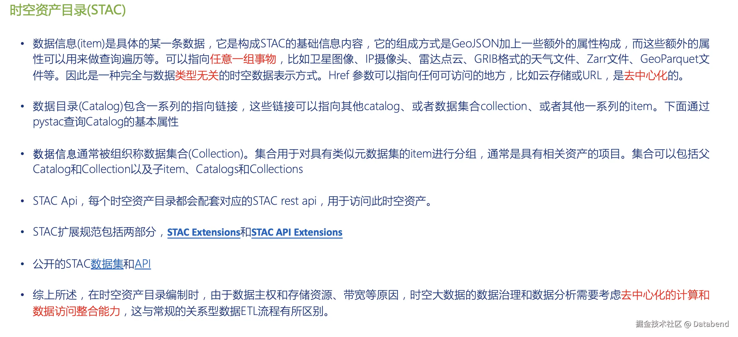 STAC 是一个开源项目,不仅定义了一些规范,还按照这套规范做了一些实验。每一个时空资产目录都会配套对应的 Rest API,用于方便地访问该时空资产。API 可以支持多语言实现,可以用 Java、Go、Python 做一些提供服务。这些资产目录可以作为服务部署在云上面,或不同的单机上去使用。此外,它还提供了一些比较开放的数据集供大家参考使用。