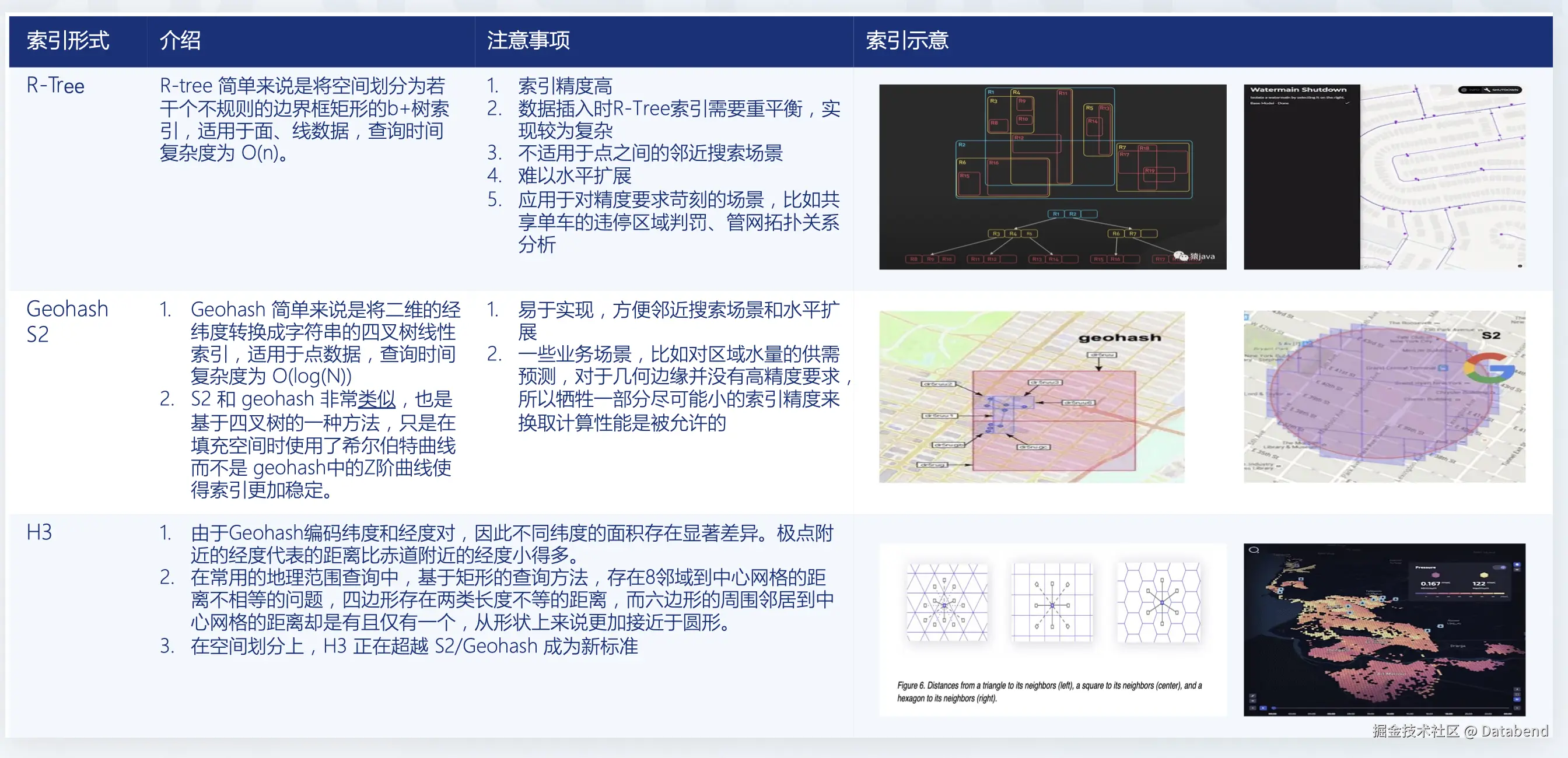 R-Tree:相当于 B-Tree 索引的空间版本,适用于复杂空间关系计算;